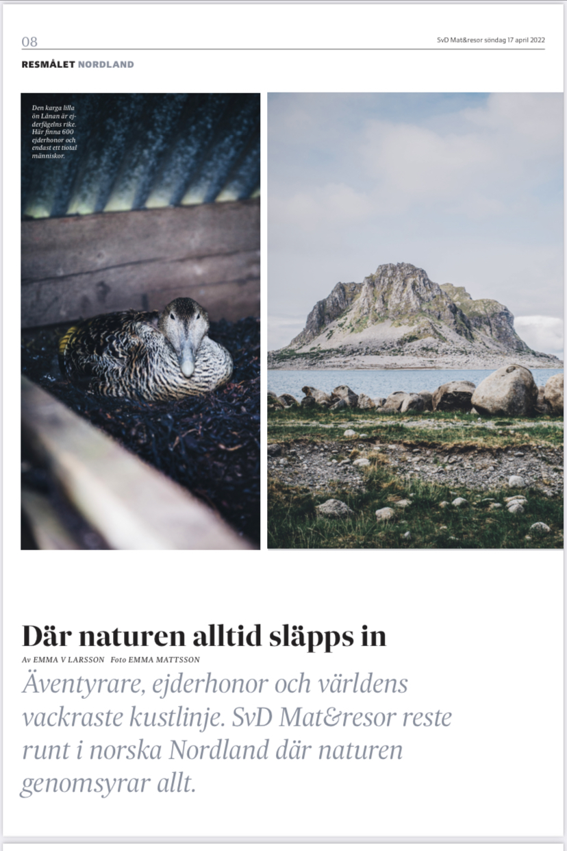 För ett par veckor sedan publicerades mitt och Emma Mattssons reportage om norska Nordland i SvD:s resebilaga. Vi vandrar på ljuvliga Vega, faschineras av ejderhonor på Lånan, paddlar, äter och njuter. Magisk resa!