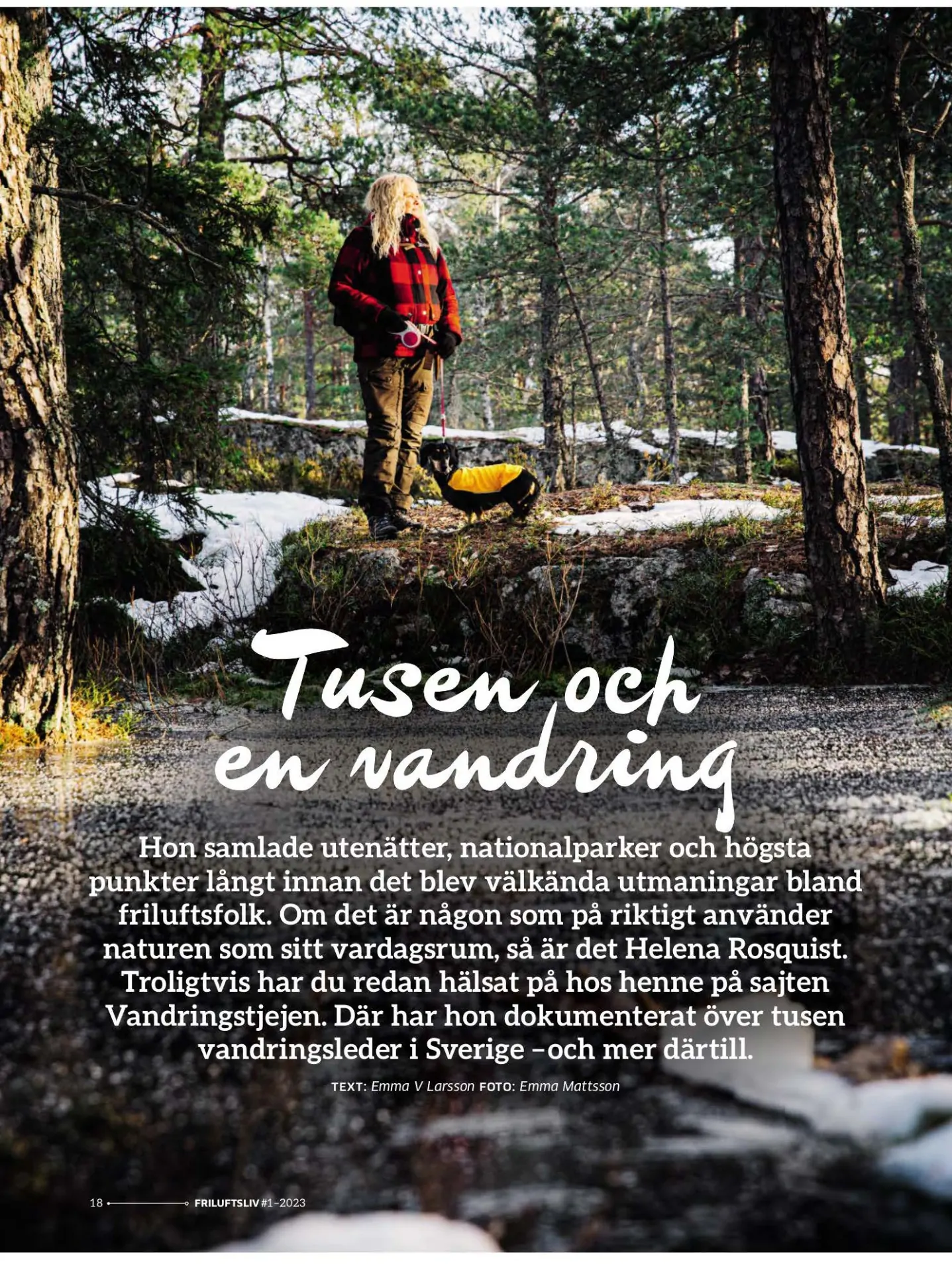 I magasin Friluftsliv nummer 1 2023 hade jag äran att få göra ett porträtt på Vandringstjejen – Helena Rosquist. Vi gjorde en fin tur i de djupa skogarna runt Tornberget medan vi pratade om friluftsliv, vandring och andra äventyr. Plåtade gjorde Emma Mattsson.