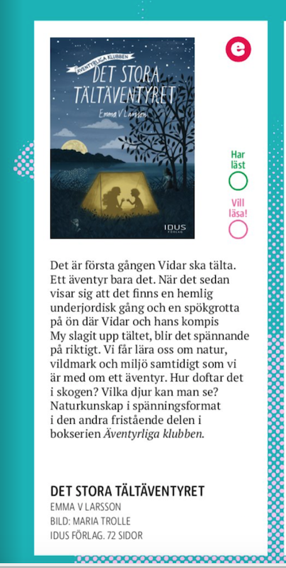 Varje år publicerat Statens kulturråd Barnbokskatalogen. Där i presenterar de utvalda barnböcker som kommit under året. Är så glad och tacksam över att Äventyrliga Klubben – Det stora tältäventyret är med!